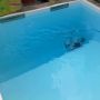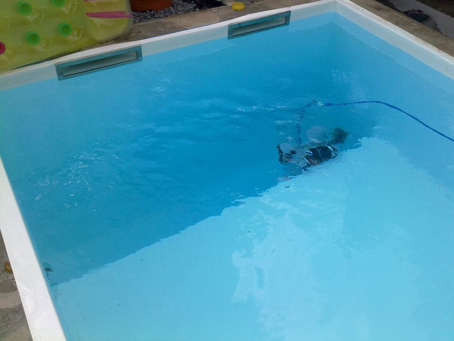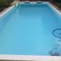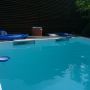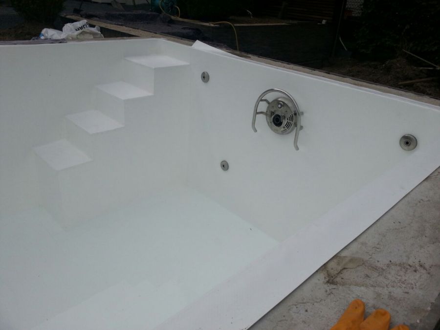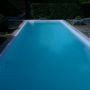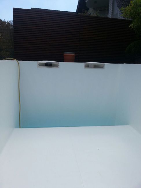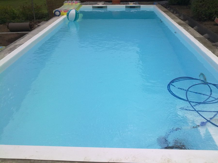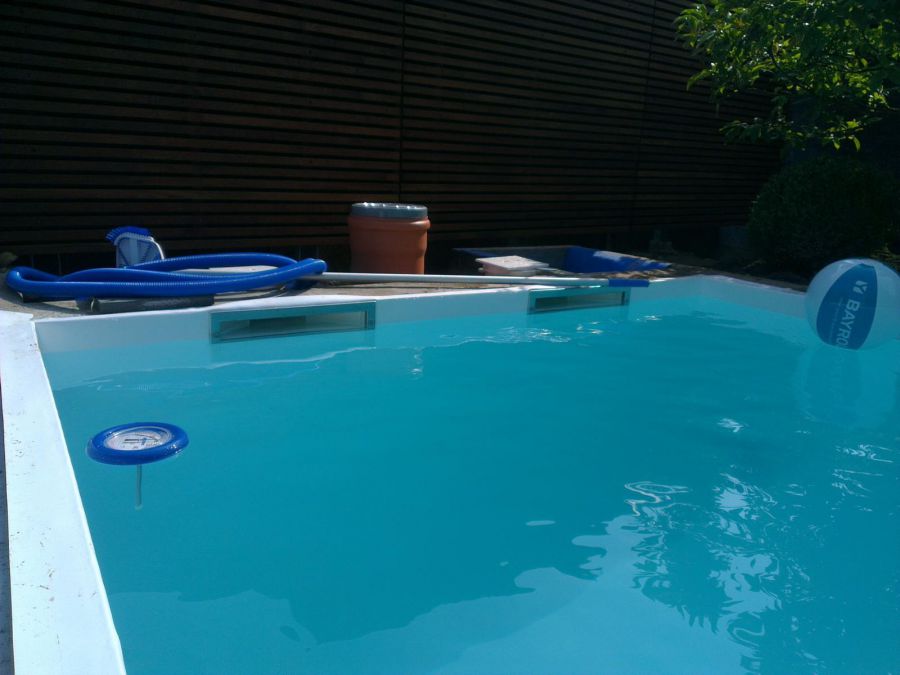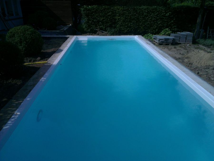 Dieses Schwimmbad wurde mit einer weißen Folie ausgekleidet, so dass die natürliche Wasserfarbe ideal zur Geltung kommt.
