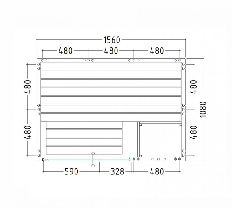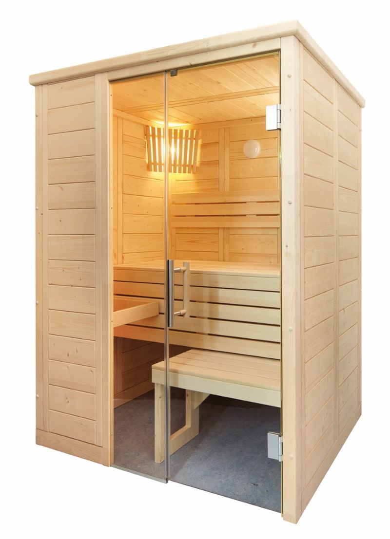 Banksichtblenden 4-fach, Ofenschutzgitter und Bodenrost aus Weichholz. Leuchte, Leuchtenschirm und Kopfstütze. Saunaofen Mini und Steuergerät.