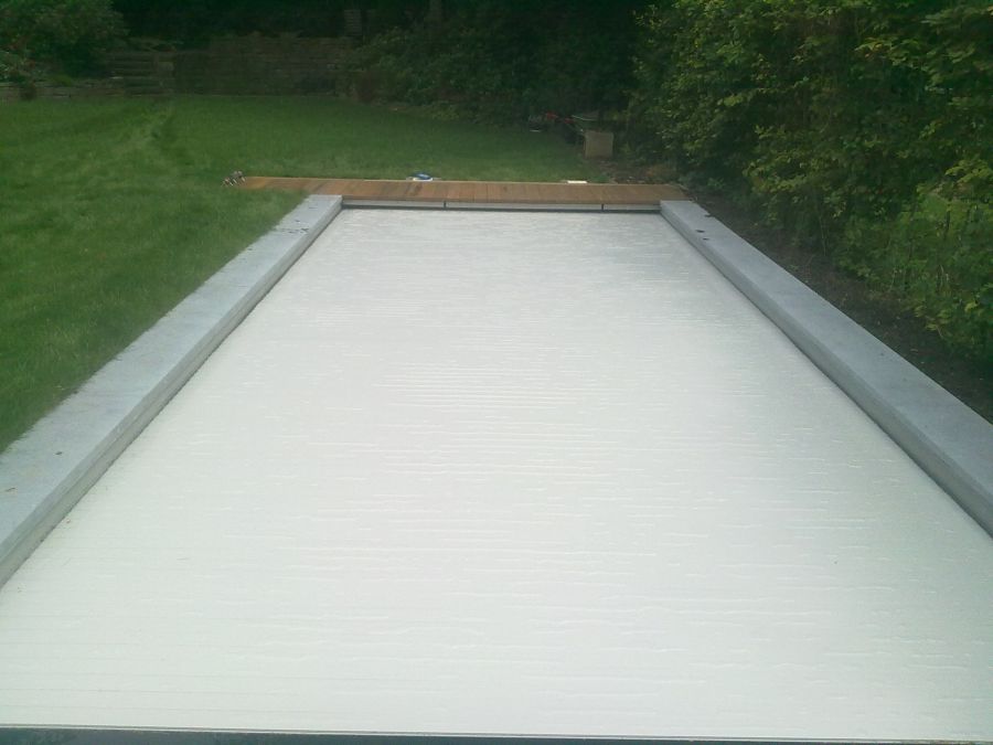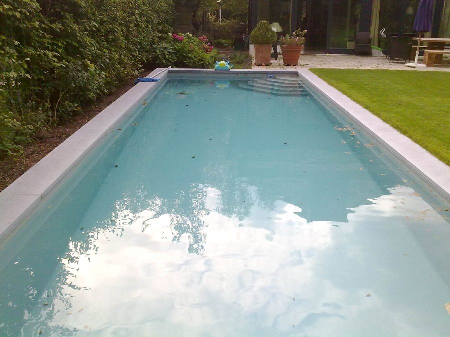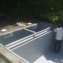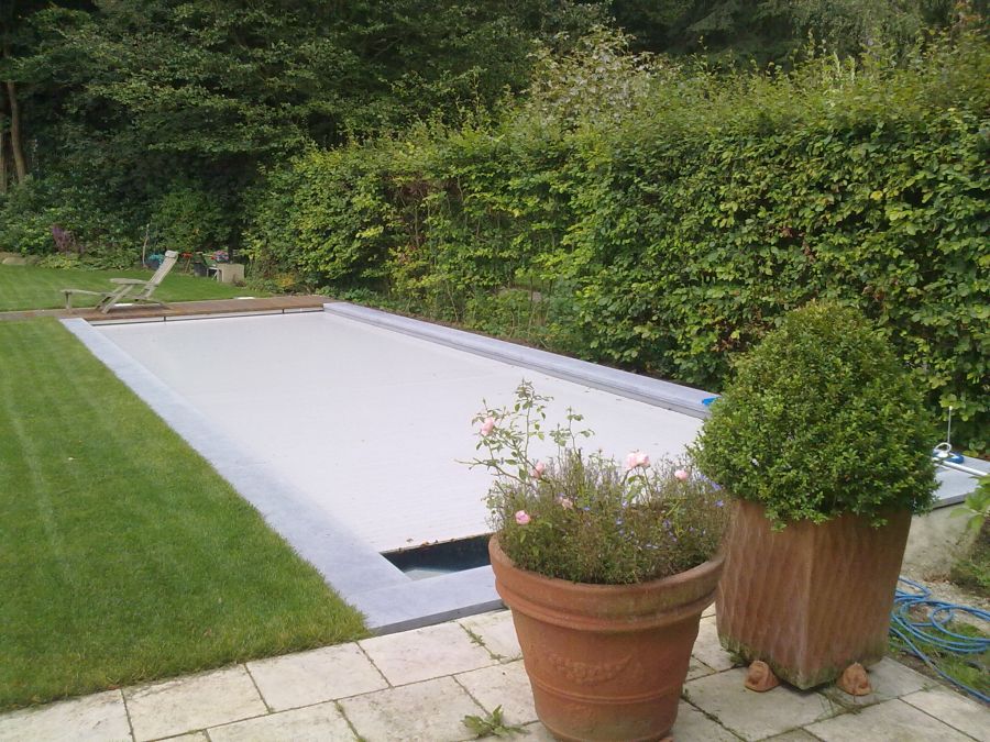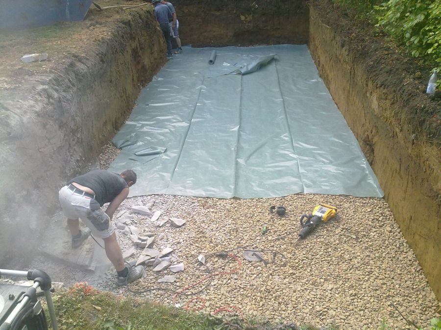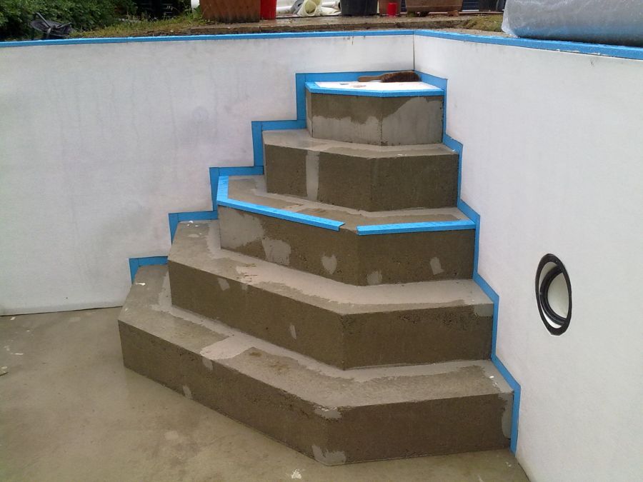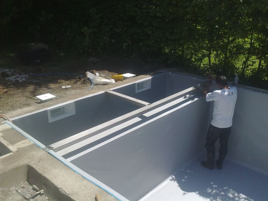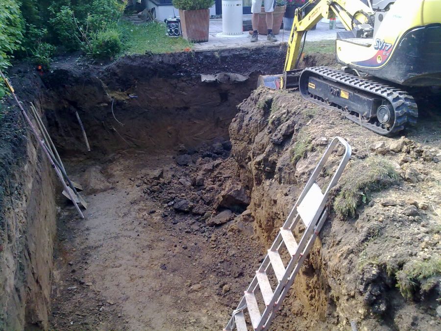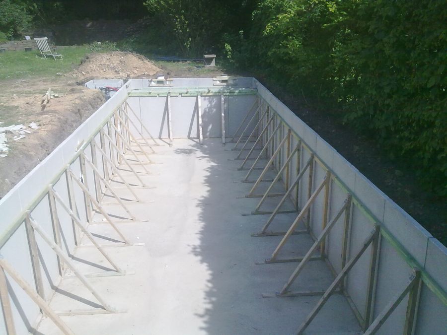 Hier sehen Sie den Bauablauf eines Außen-Schwimmbeckens mit hellgrauer Folienauskleidung, Innenmaße: 11,00m x 3,50m. Auch der Erdaushub und die Rohbauarbeiten, hier mit dem innovativen Isobeton-System, wurden von uns ausgeführt. Die Anlage ist ausgestattet mit hochwertiger Meß- und Regeltechnik, Wärmetauscher und Unterflur-Rolladenabdeckung.