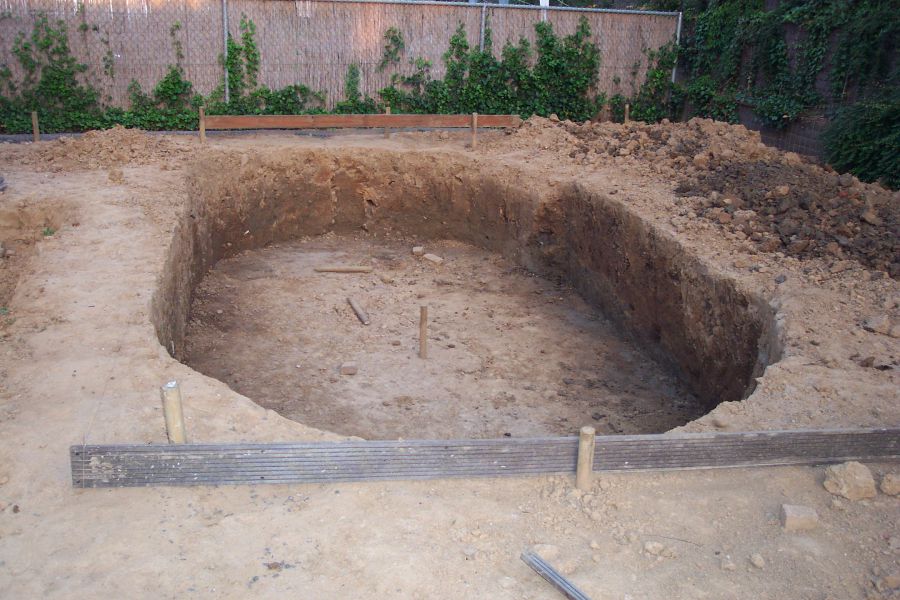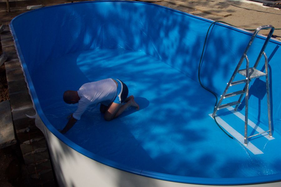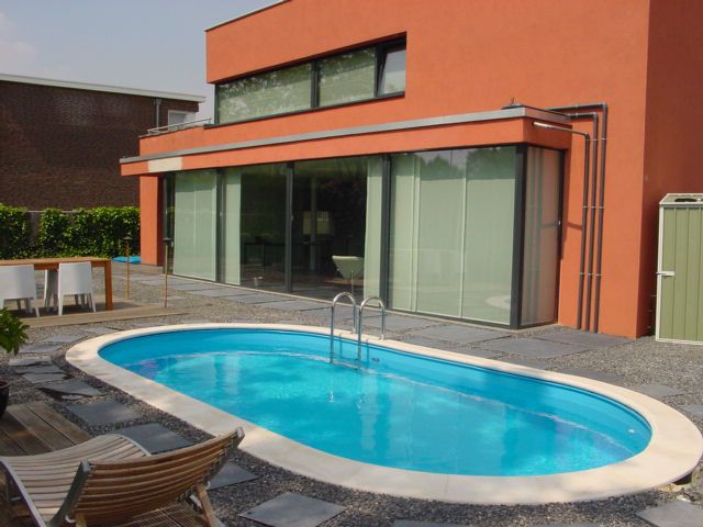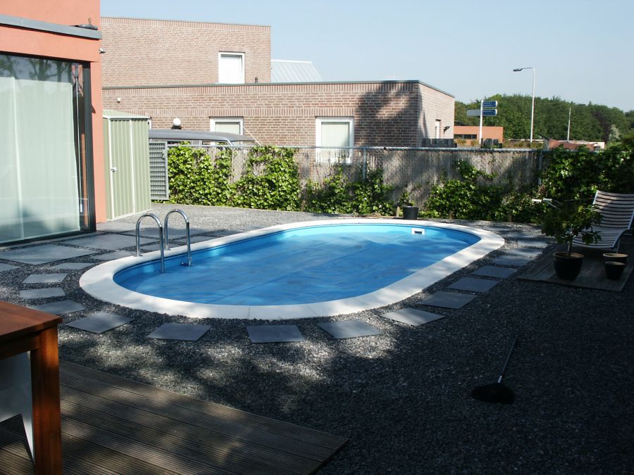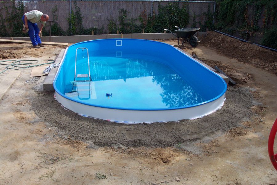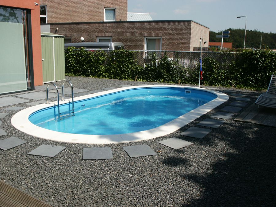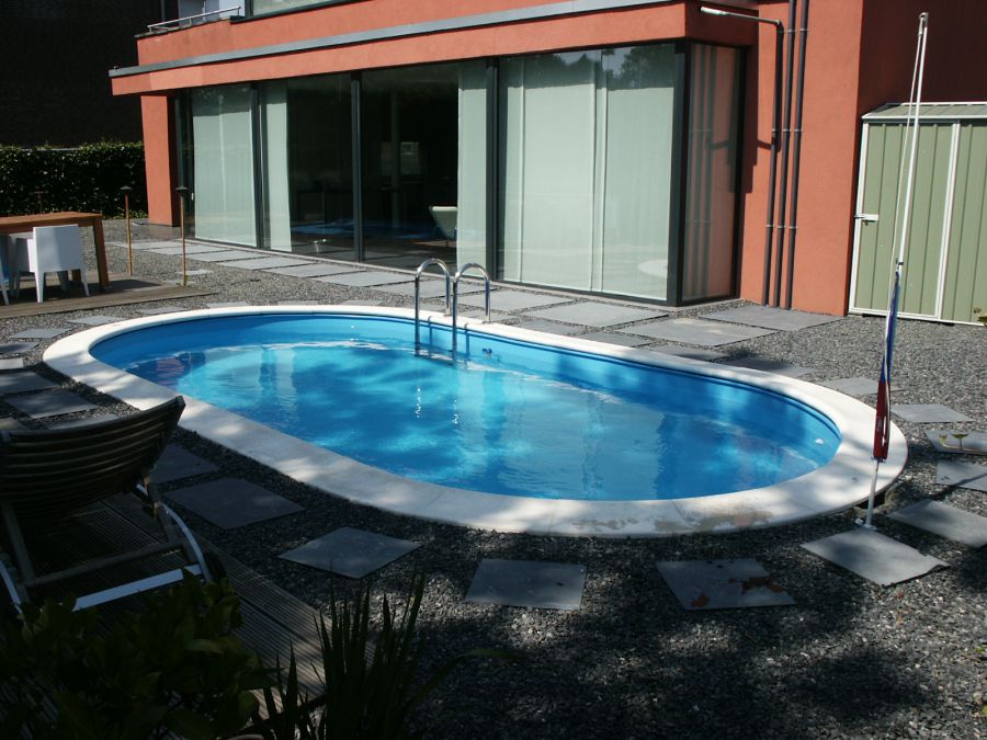 Stahlwandbecken mit Einhängefolie als Selbstbaupaket, Innenhülle 0,6mm dick, Becken in Ovalform, 6,30m x 3,60m x 1,20m