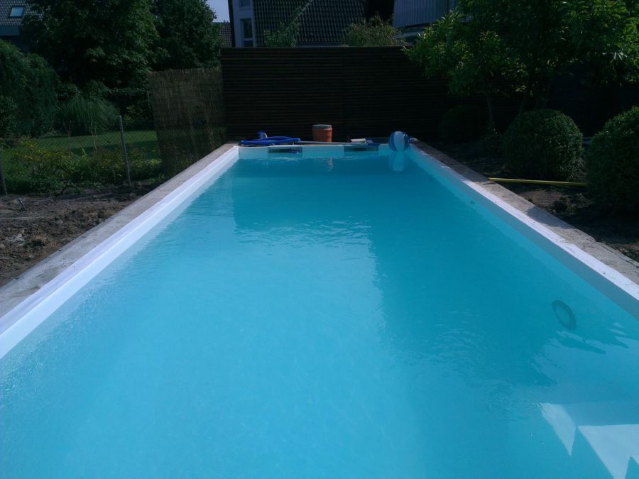 Sehen Sie hier einige von uns realisierte Außenbecken-Anlagen. Wir zeigen Selbstbauvarianten, individuelle Folienauskleidungen und ein Fertigbeckenprojekt.Schwimmbecken mit hellblauer Folienauskleidung nahe Düsseldorf – incl. Rohbauarbeiten