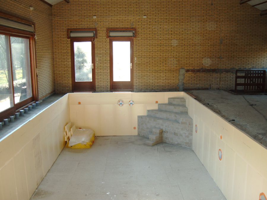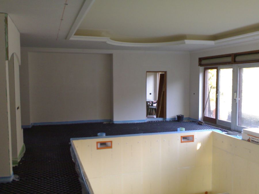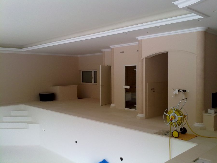 Das vierzig Jahre alte Hallenbad wurde umfangreich umgebaut und auf den allerneuesten technischen Stand gebracht. In Zusammenarbeit mit einem Spezialbetrieb entstand der Innenausbau inklusive Dämmung, Dampfsperre und Zwischendecke.