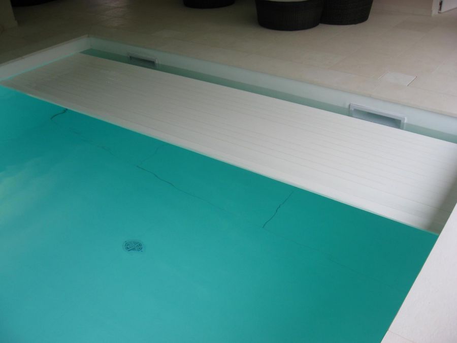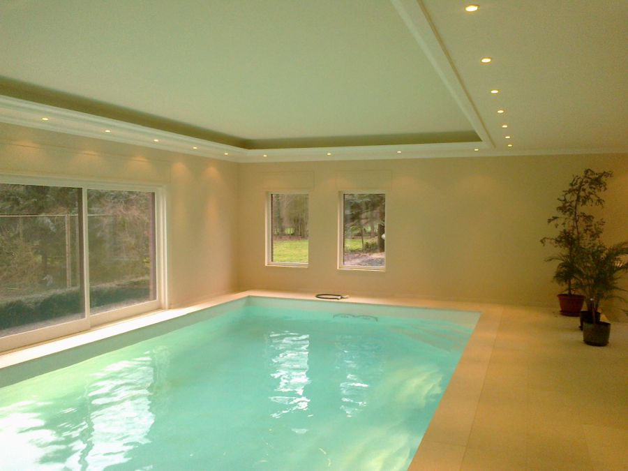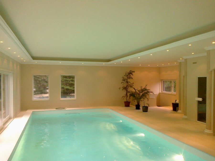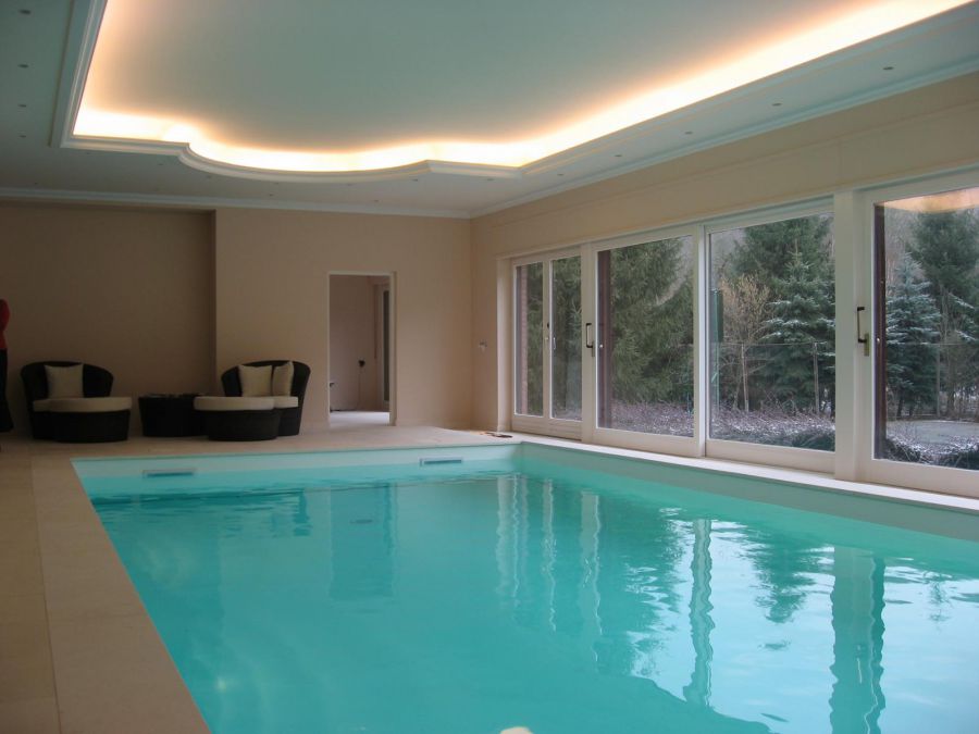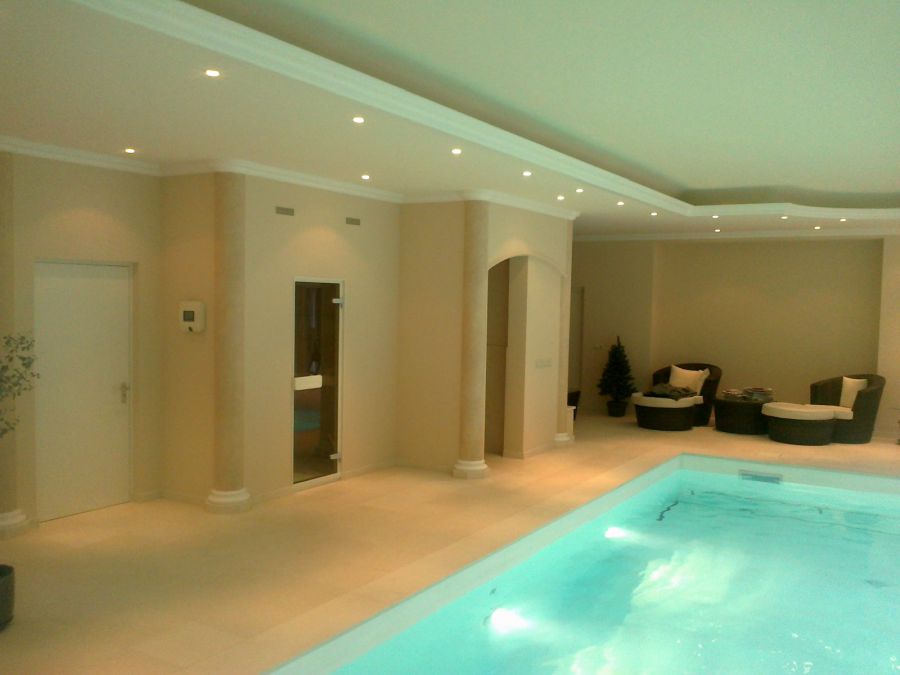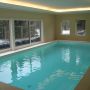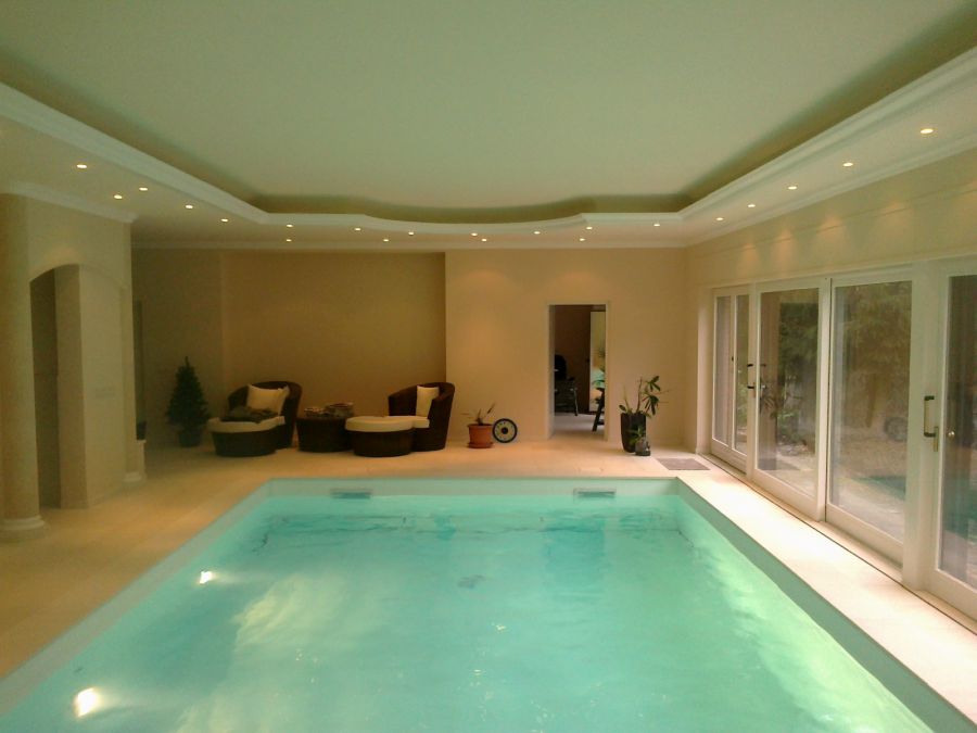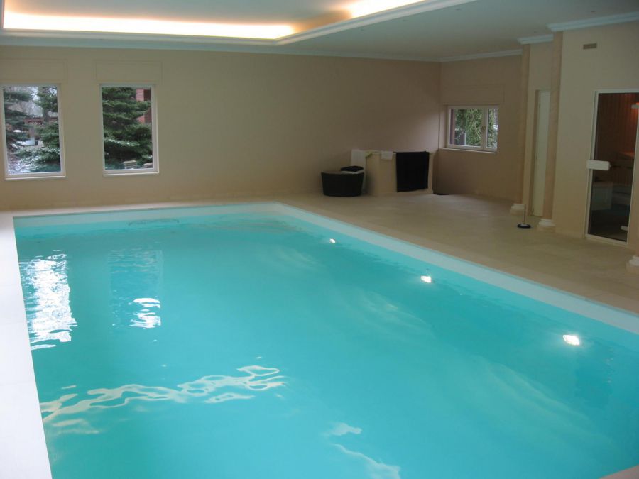 Wir lieferten und installierten das neue Becken, mit weißer Folienauskleidung, hochwertiger Wasseraufbereitungstechnik und Rollladenabdeckung, eine luxuriöse Sauna und eine Lüftungs- und Entfeuchtungsanlage für perfektes Raumklima.